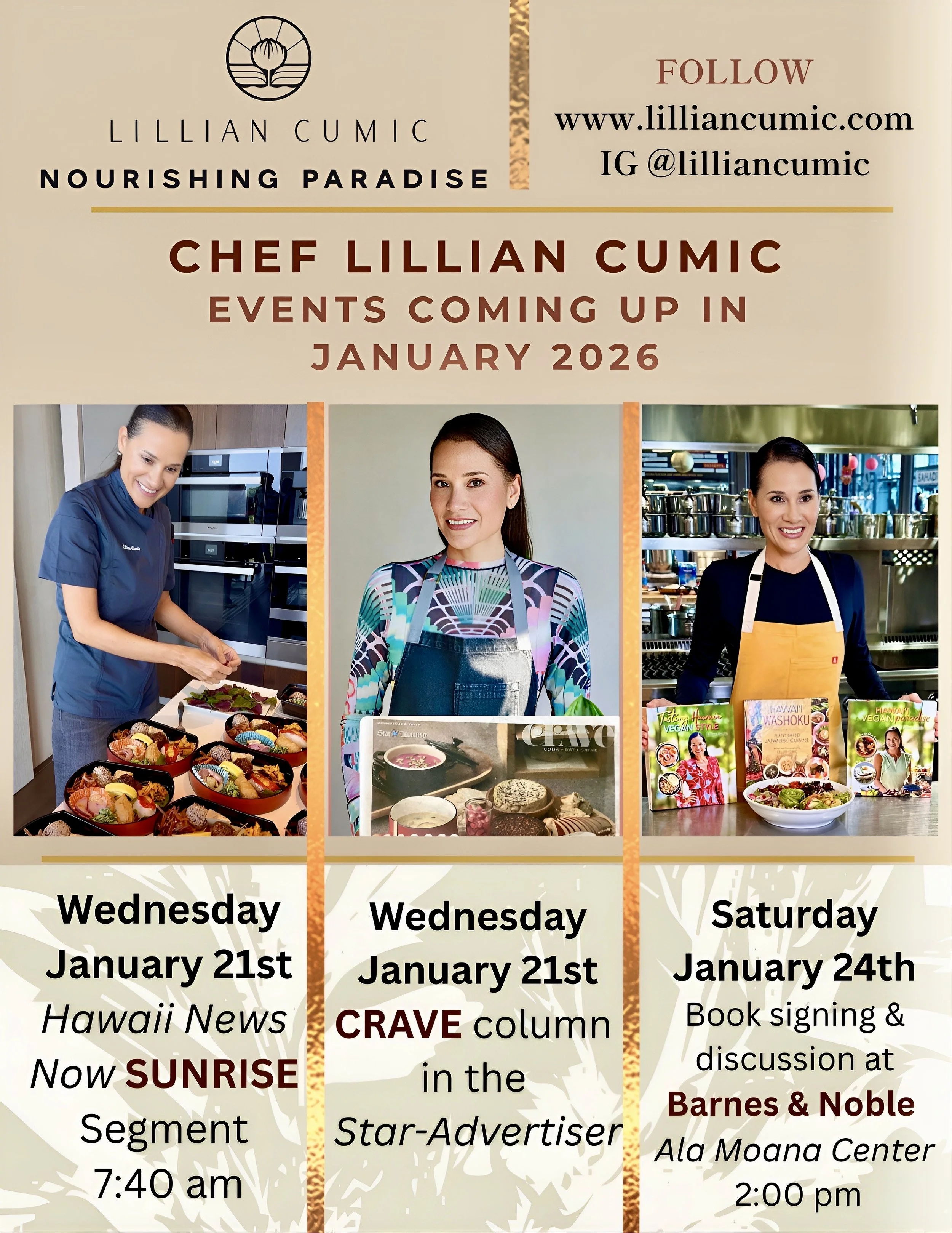 Lillian Cumic is the author of the cookbooks- Hawai‘i A Vegan Paradise, Tasting Hawai‘i Vegan Style, and Hawai‘i Washoku, and a Hawai‘i-based vegan chef, columnist, and former model. She shares how to nourish your paradise from the inside out and the outside in, empowering you to live a conscious, vibrant, and healthy lifestyle.