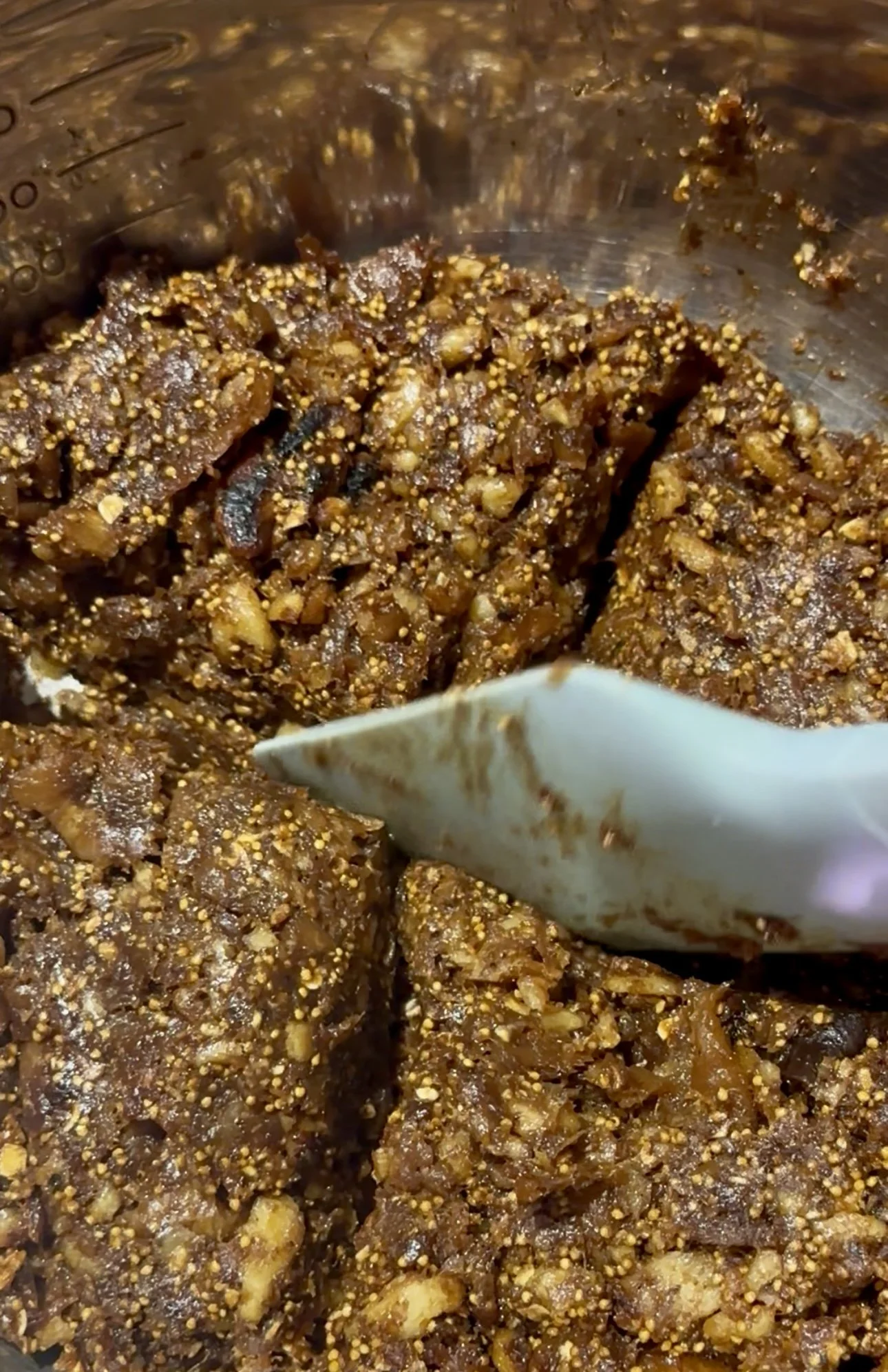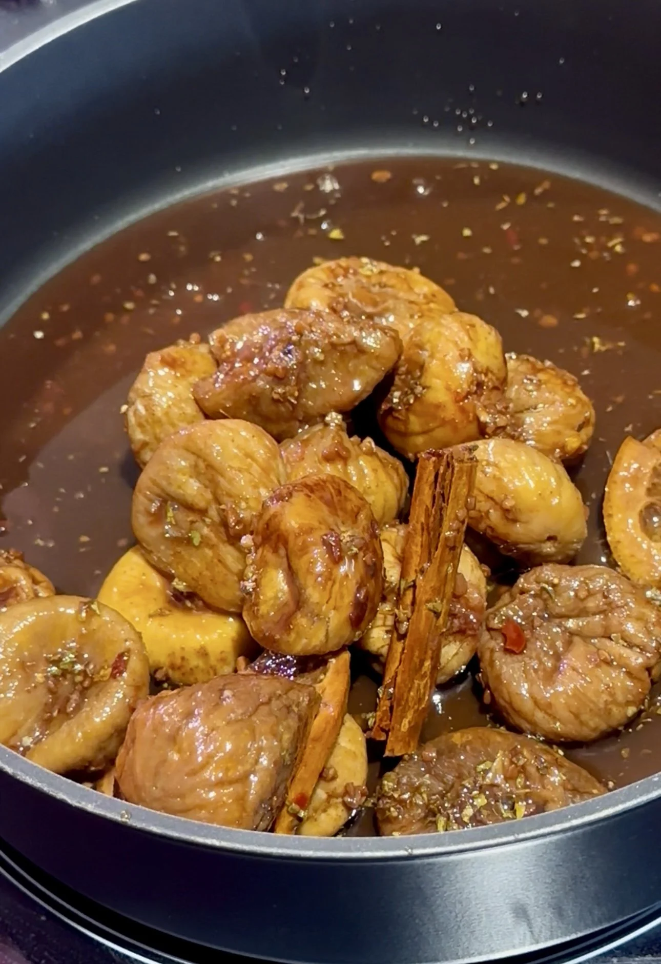 I began by soaking twenty dried figs in a cup of red wine or dealcoholized wine, along with four sundried tomatoes, a cinnamon stick, a slice of fresh or dried orange, five dried cloves, a tablespoon of dried roasted garlic and herbs spice mix, a pinch of dried oregano, fennel and red pepper flakes. The mixture marinated for two days to allow the flavors to fully meld.