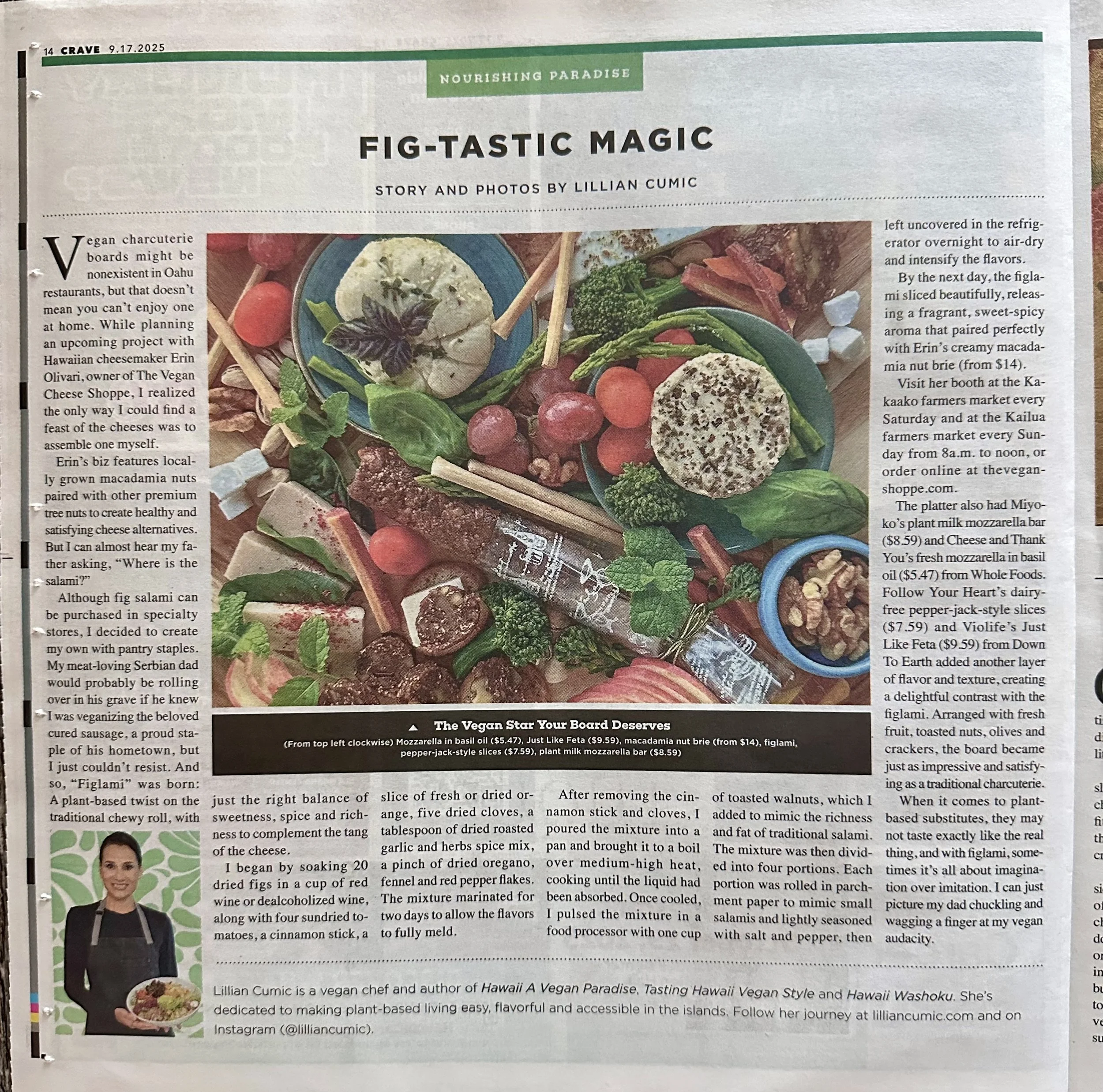 Vegan charcuterie boards might be nonexistent in Oahu restaurants, but that doesn’t mean you can’t enjoy one at home. While planning an upcoming project with Hawaiian cheesemaker Erin Olivari, owner of The Vegan Cheese Shoppe, I realized the only time I would find a feast of the cheeses was to assemble one myself. Erin’s biz features locally grown macadamia nuts paired with other premium tree nuts to bring healthy and satisfying cheese alternatives. But I can almost hear my father asking, “Where is the salami?”