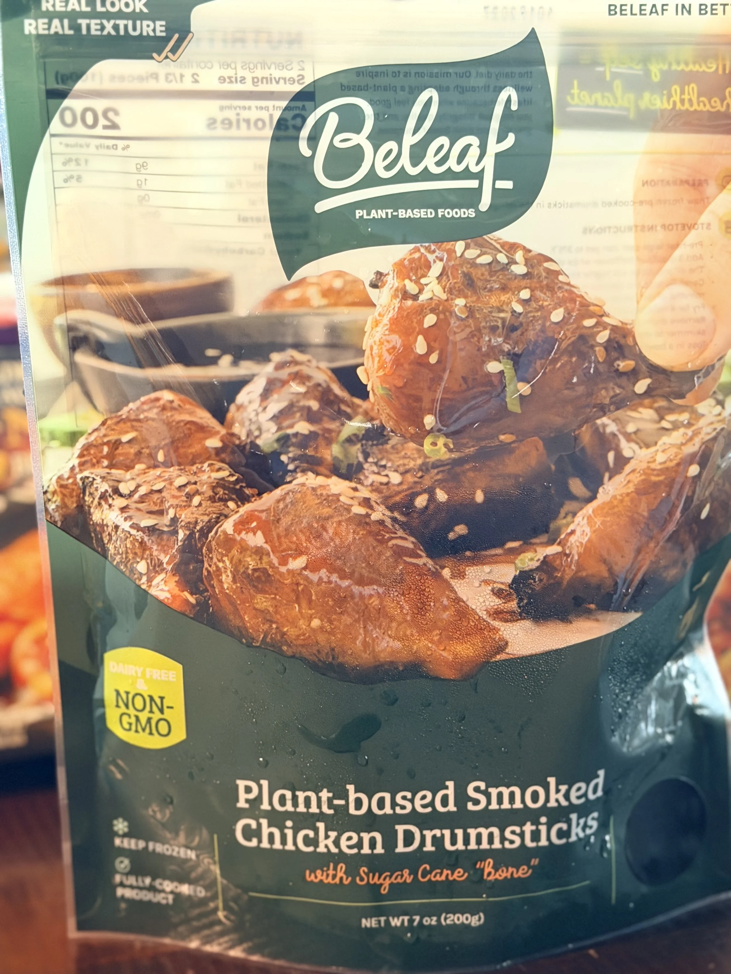 Belief’s Plant-Based Chicken Drumsticks ($7.59) have a juicy, meaty texture complete with a sugar cane “bone”.