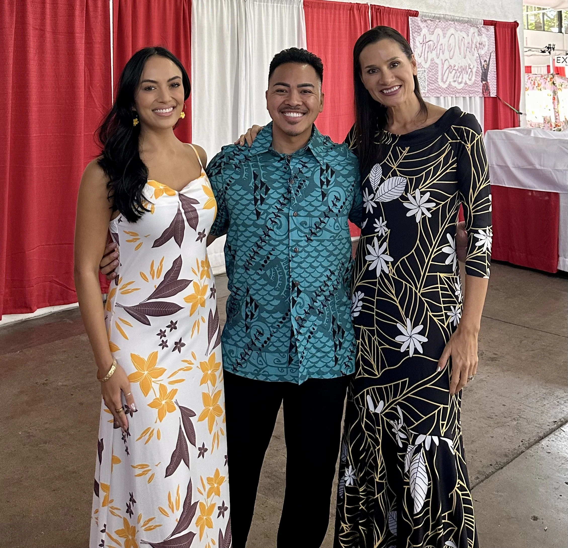 Keana Marie and Living 808 host Mikey Minis wearing designs by Wahine Toa.
